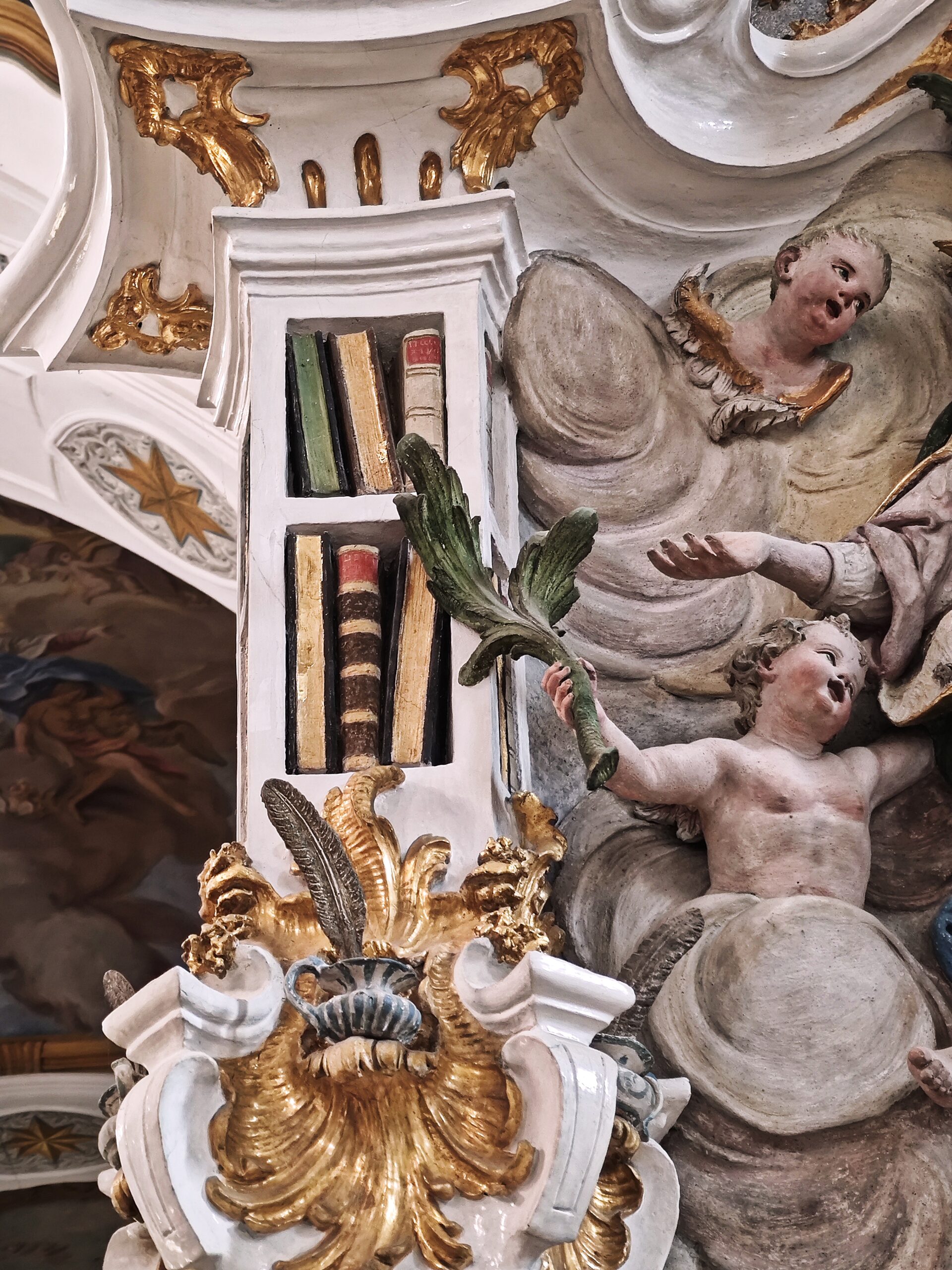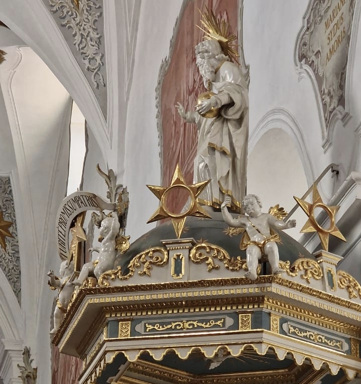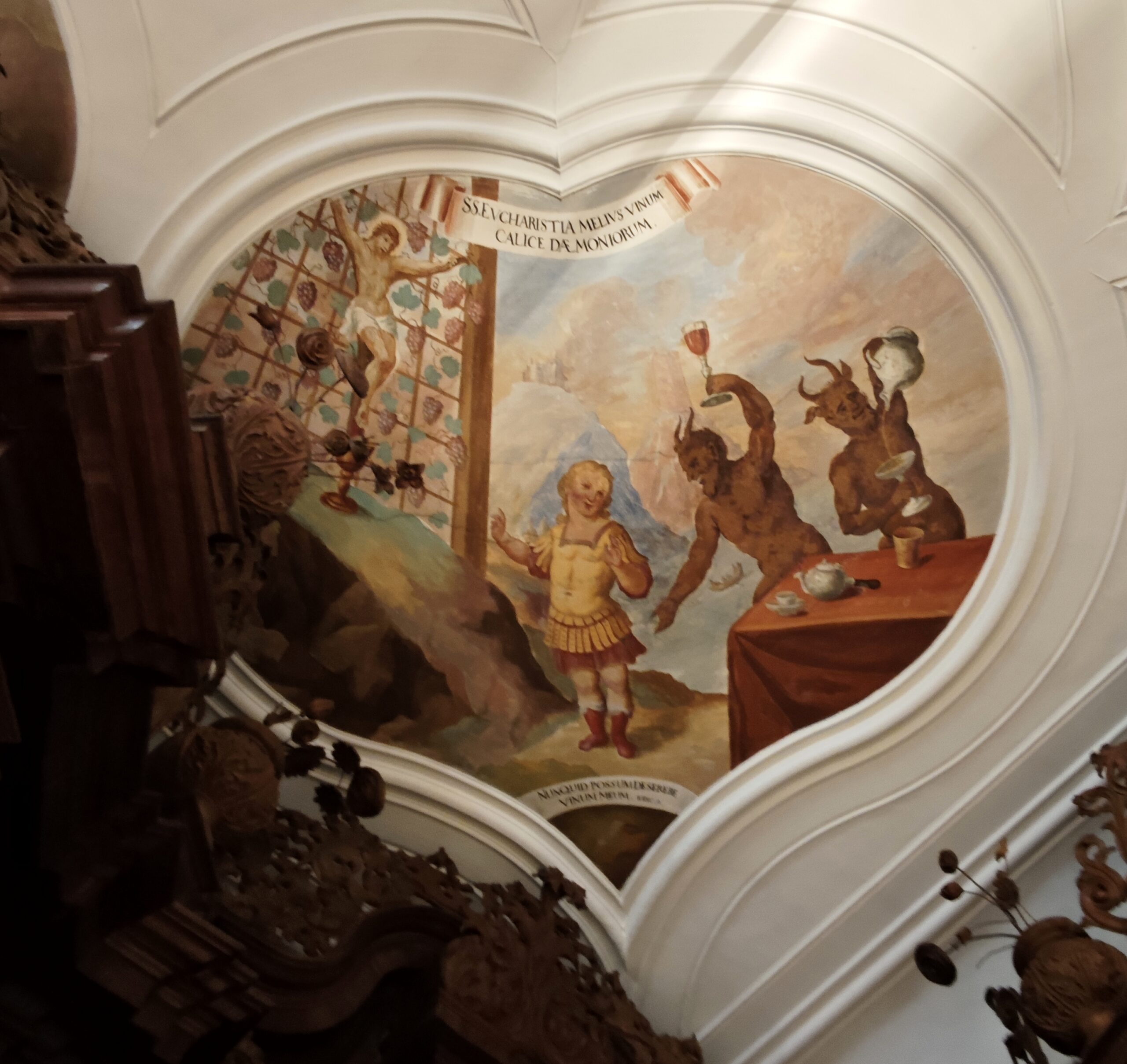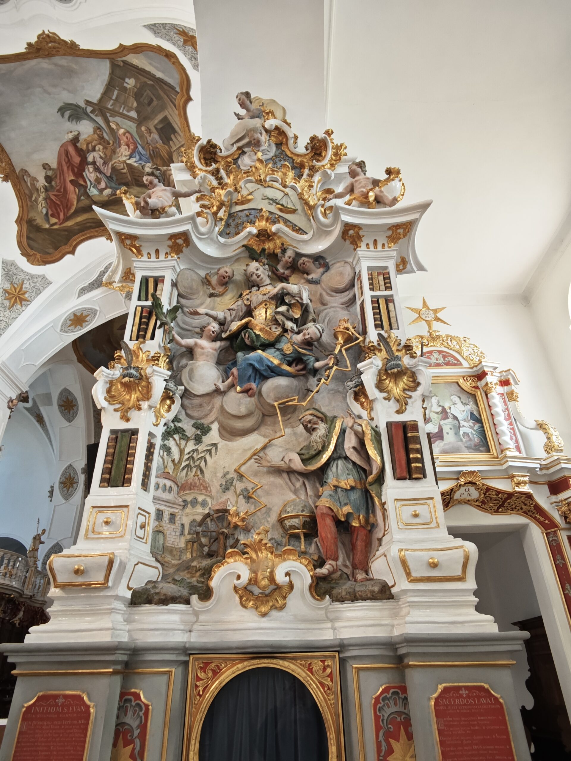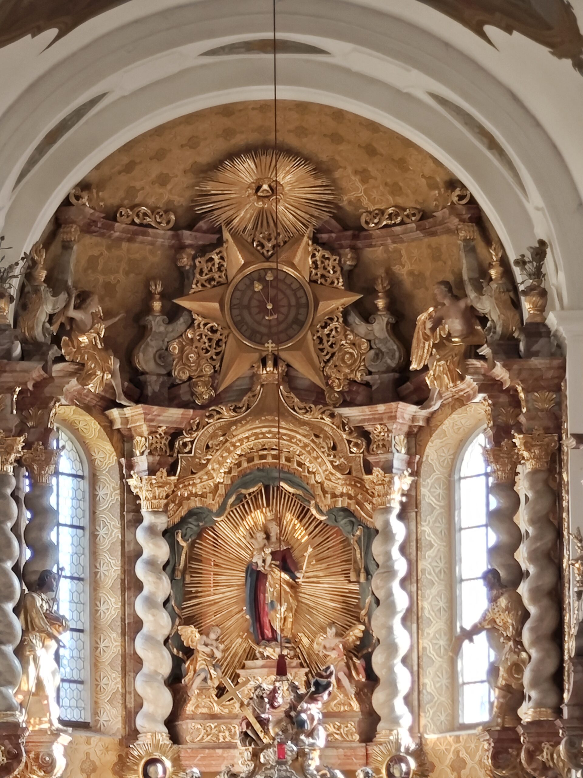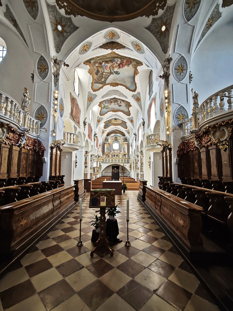 Попри це, епітет Володарка Зірок (Herrin der Sterne) я зустріла вперше у храмі абатства Віндберга. Вочевидь, це локальний вираз, що вживають до Діви Марії, яка знаходиться посеред величезної кількості зірок: усього їх у цій церкві 365 – стільки, скільки ж, скільки днів у році. Пояснення цьому декору досить просте, але неочікуване – абат Бернард Штрелін, який керував переоформленням храму в найкращий період монастиря, що припав на XVIII ст. (ще перед секуляризацією), був не тільки глибоким теологом та очільником монашої спільноти, але й астрономом-аматором.