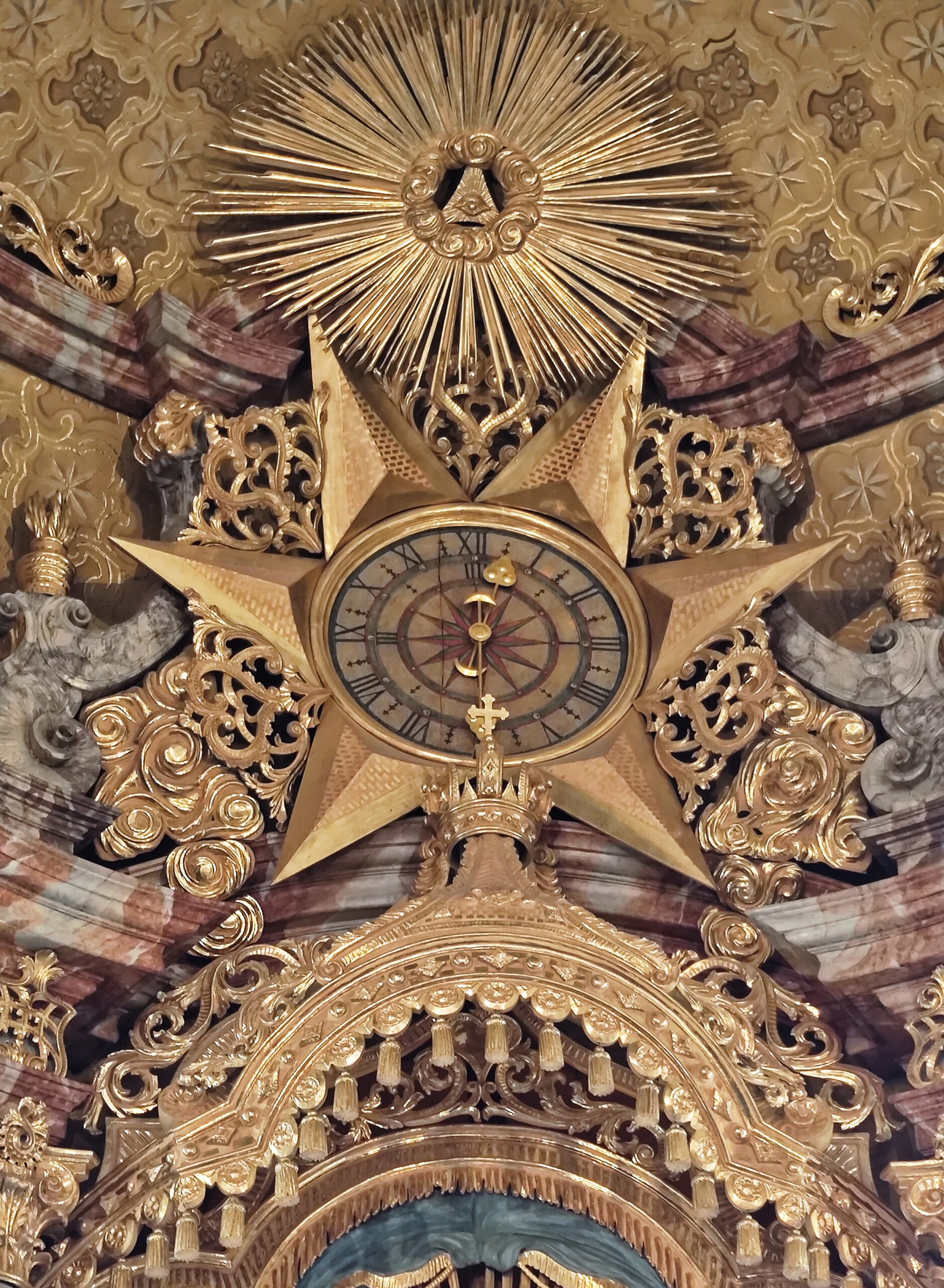 Найголовінша зірка прикрашає вівтар. Щодуже незвично, так це те, що вона служить оправою для годинника. Годинники у всередині європейських церква зустрічаються, але я ніколи не бачила їх у вівтарних частинах.